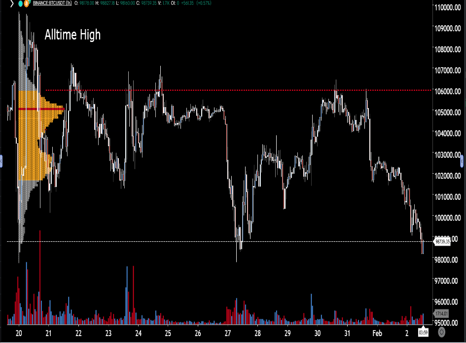 Auf dem Wirtschaftsgipfel in Davos machte der Satz die Runde, daß Bitcoin nun bald in die „Bananen Zone“ eintritt, ein Begriff aus dem Krypto Handel, bei dem die Preise plötzlich in die Höhe schießen. Daneben gibt es Stimmen, die diesen Sektor mit Sportwetten vergleichen und ein unvermeidliches Platzen der Blase voraussagen. Wie stellt sich die Situation unter dem objektiven Aspekt der VMO-Analyse dar? Bitcoin Future, Januar 2025, TPO, 60-Minuten Chart